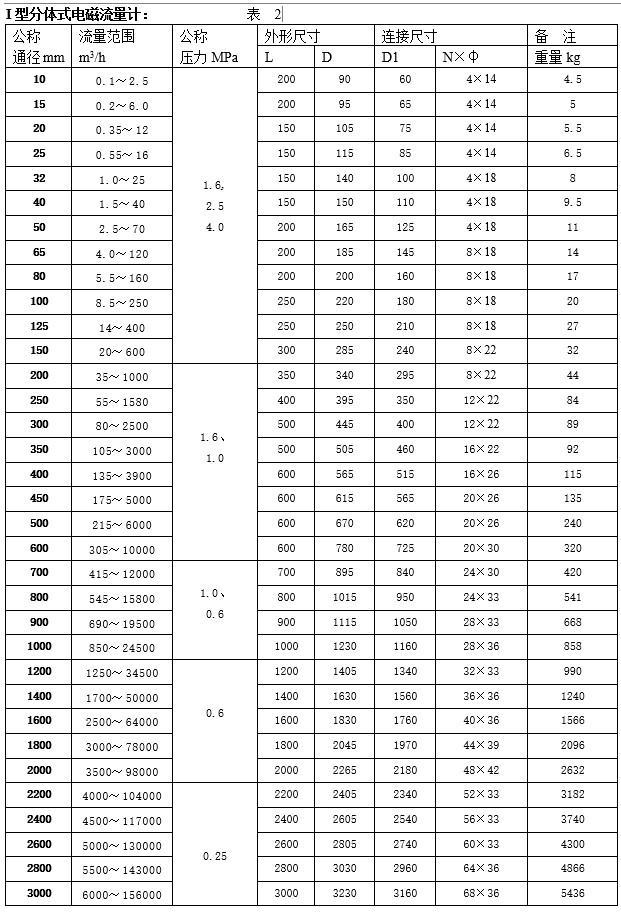 I型一體式電磁流量計口徑DN(mm): 10、15、20、25、32、40、50、65、80、