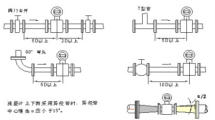 直管段長度為了保證電磁流量計的測量準(zhǔn)確度和穩(wěn)定性,流量計安裝位置上下游應(yīng)滿足下圖所示的管路條件。