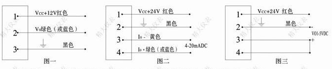 ELZ-Ⅱ型標(biāo)準(zhǔn)電流模擬量4-20mA輸出:工作電壓VCC+24V,最大工作電流0.2A,負(fù)載電阻最大500Ω(恒流),接線見(jiàn)圖二;或標(biāo)準(zhǔn)電壓模擬信號(hào)Vo1~5V輸出,接線見(jiàn)圖三)