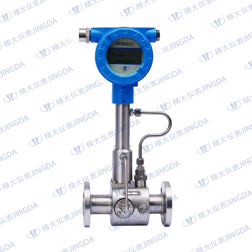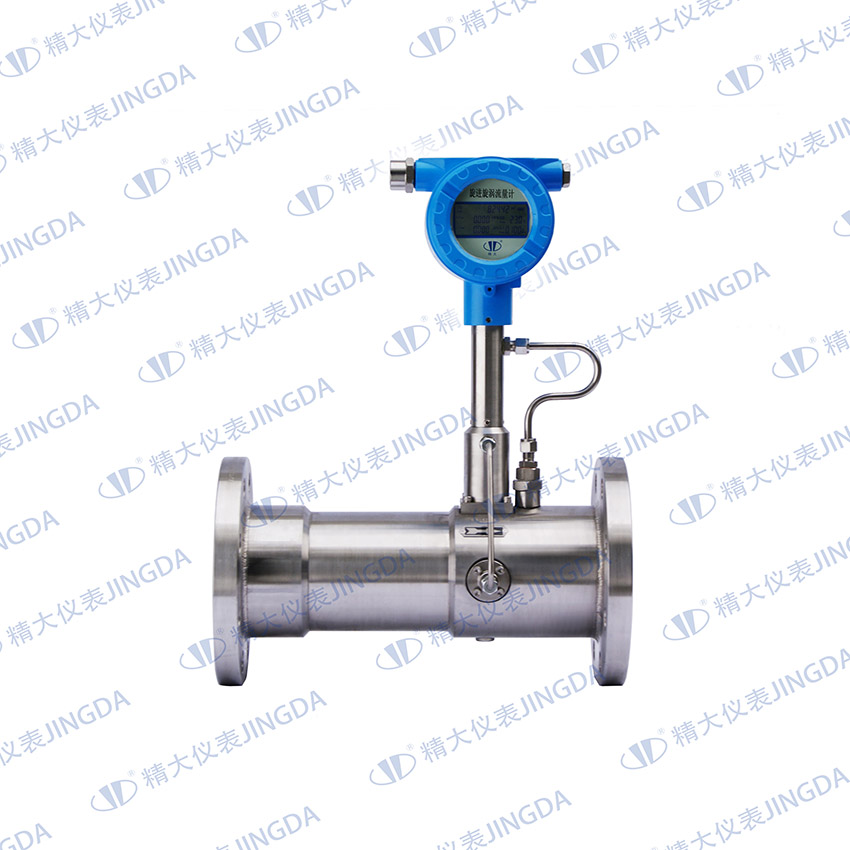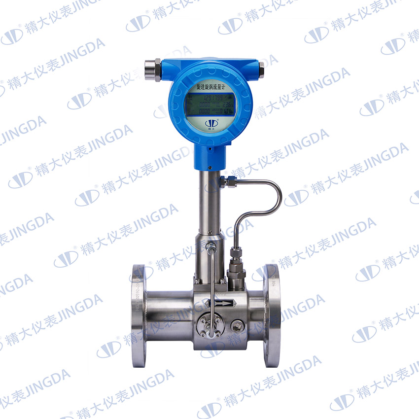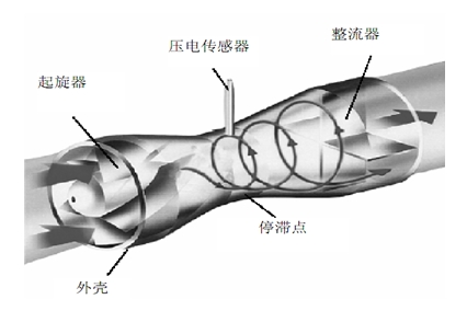 當沿著軸向流動的流體進入流量計入口時,螺旋形葉片強迫流體進行旋轉運動,于是在旋渦發(fā)生體中心產生螺旋流,旋渦流在文丘利管中旋進,到達收縮段后,因回流作用強迫進行旋進式二次旋轉。此時旋渦流的旋轉頻率與介質流速成正比,并為線性。兩個壓電傳感器檢測的微弱電荷信號同時經前置放大器放大、濾波、整形處理后,變成兩路頻率與流速成正比的脈沖信號進行比較和判斷,剔除干擾信號,并同固定在殼體上的溫度傳感器、壓力傳感器檢測到溫度、壓力信號一起,送入智能化積算儀進行運算處理,即可求得流量及相關數(shù)據。